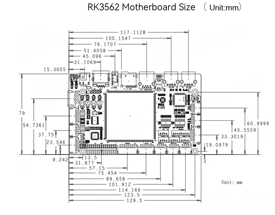 మోడల్: RK3562/RK3562JCPU: క్వాడ్-కోర్ కార్టెక్స్-A53, ప్రధాన పౌన frequency పున్యం 2.0GHZGPU వరకు: మాలి-G52NPU: 1TOP లు కంప్యూటింగ్ పవర్ (NPU లేకుండా పారిశ్రామిక-గ్రేడ్ RK3562J)